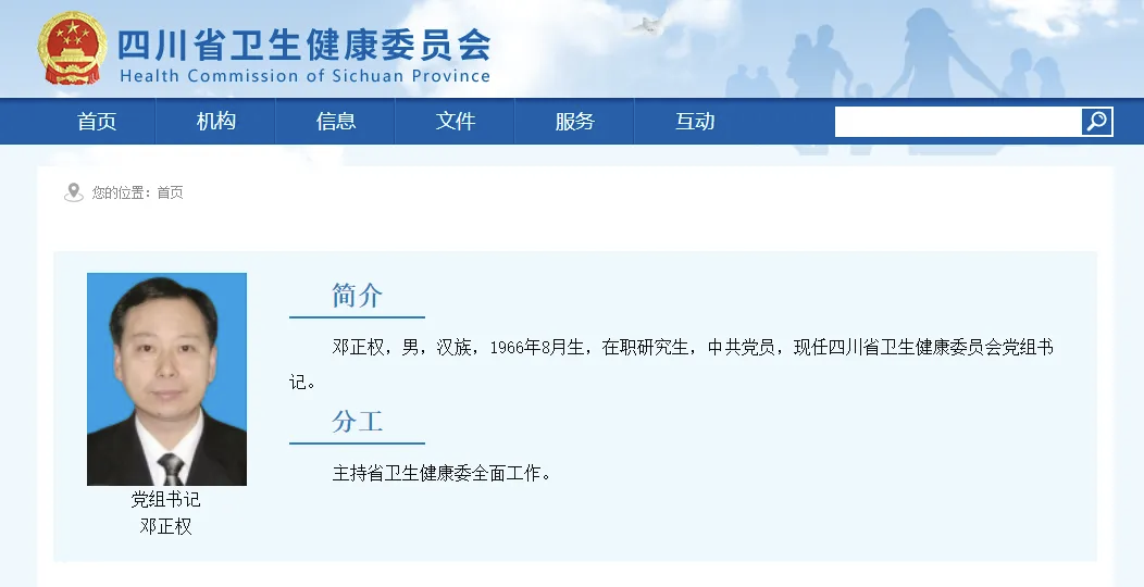 据四川省卫生健康委员会网站消息,邓正权已任四川省卫生健康委党组书记,主持省卫生健康委全面工作。公开资料显示,邓正权,男,汉族,1966年8月生,在职研究生,中共党员。此前,四川省卫生健康委党组书记由徐斌担任。
