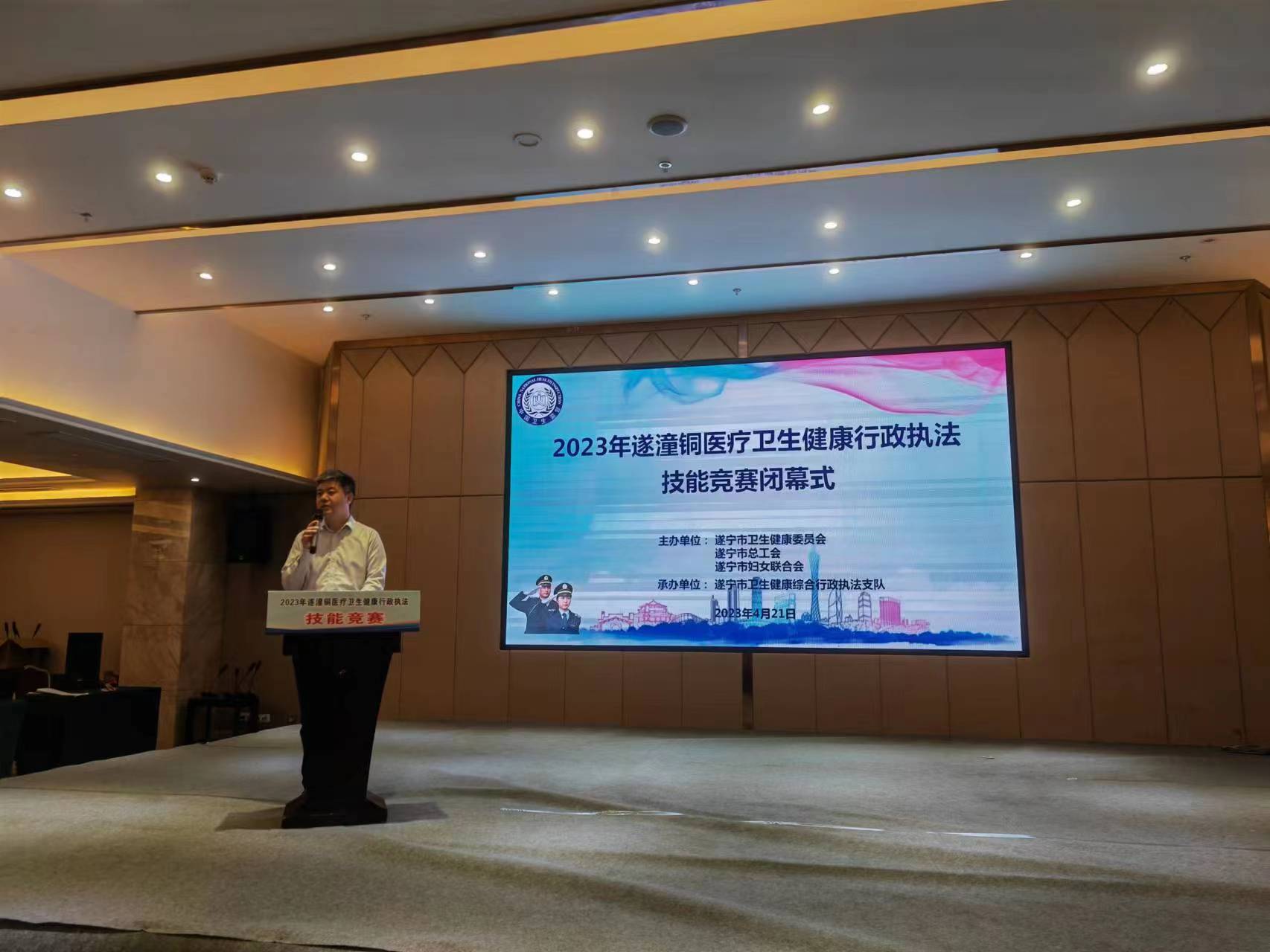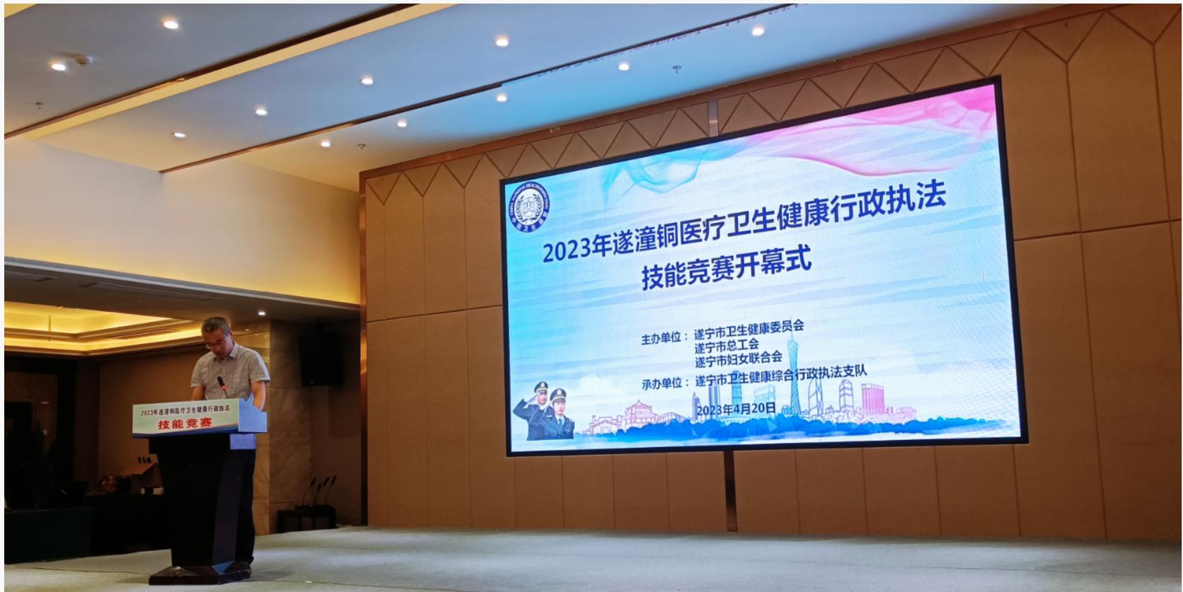 为深入贯彻落实中共中央、国务院《成渝地区双城经济圈建设规划纲要》,进一步深化川渝两地卫生健康合作,推动健康中国建设的任务和目标在卫生健康领域走深走实。2023年4月20日上午,遂(宁)潼(南)铜(梁)医疗卫生健康行政执法技能竞赛正式拉开帷幕。本次竞赛由遂宁市卫生健康委员会、遂宁市总工会、遂宁市妇女联合会联合举办。市卫生健康委员会副主任邓成立,市卫生健康综合行政执法支队支队长赵勇,重庆市潼南区卫生健康综合行政执法支队副支队长欧新,重庆市铜梁区卫生健康综合行政执法支队副支队长曾茂等领导出席开幕仪式,遂宁市及重庆市潼南区、铜梁区共计12支执法队伍的64名选手参加开幕仪式。