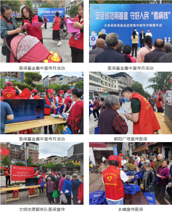 2020年至今,每年的医保基金监管集中宣传月期间多次在大英县人流量较大的政府广场以及朝阳广场以及乡镇开展宣传活动。活动期间共计张贴海报上千份,发放宣传手册万余份,在大英县政府广场、朝阳广场以及定点医药机构等点位滚动播放公益广告以及医保宣传动画,现场为参保群众解答医保问题,大英县广播电视台多次进行了现场的深入报道。