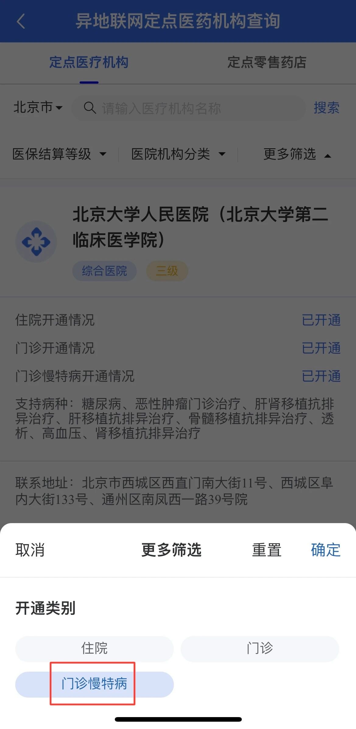 第三步:选择【就医城市】→【更多筛选】→【门诊慢特病】,就可以查到支持门诊慢特病种跨省直接结算的定点医疗机构。医疗机构下方有注明已开通的病种。