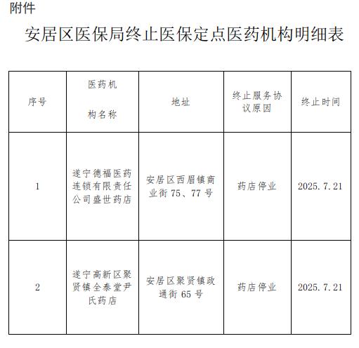 遂宁市安居区医疗保障局关于公布终止医保定点医药机构名单的通知(7月)