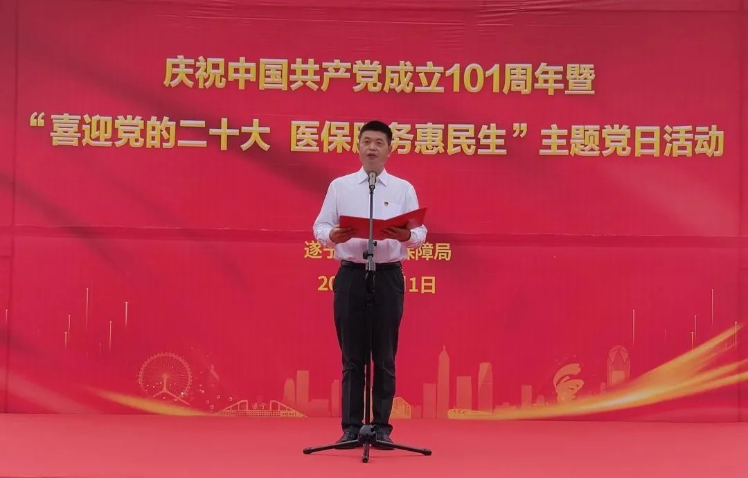 7月1日,由市医保局牵头,会同重庆市潼南区医保局、铜梁区医保局在遂宁高新区西宁街道兰井村,共同开展庆祝中国共产党成立101周年暨“喜迎党的二十大 医保服务惠民生”主题党日活动,将20项医保经办事项下沉到兰井村,建设医保经办事项下沉村社示范点,用医保为民惠民的实际行动和具体实践,向党的101周年华诞和党的二十大献礼!市医保局党组书记、局长张智勇出席活动并讲话。