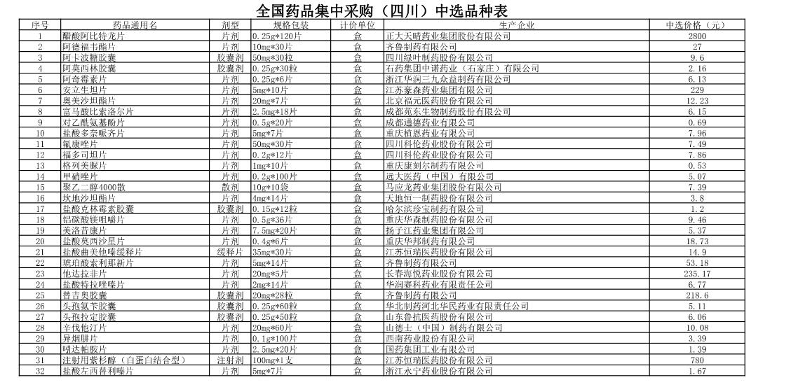 本次集中采购的32种药品覆盖多个治疗领域,药价平均降幅53%,最高降幅达93%以上,一些老百姓常用药降价明显,如阿卡波糖、格列美脲片价格分别降低了81.26%和93%以上。