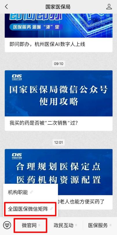 国家医保局微信公众号整合了全国医疗保障系统微信公众号平台资源,设立了“全国医保系统微信矩阵”,参保群众、医疗机构、医药企业等可通过点击国家医保局微信公众号首页下方“微官网”版块进入“全国医保微信矩阵”,即可直接链接至全国各省份及下辖设区市(直辖市为市辖区)医保部门微信公众号,可以实时查看各地最新的医保政策,办理当地的医保业务等。