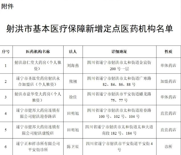 射洪市医疗保障事务中心关于将射洪涂仁堂大药房(个人独资)等6家医药机构纳入医保定点协议管理的通知