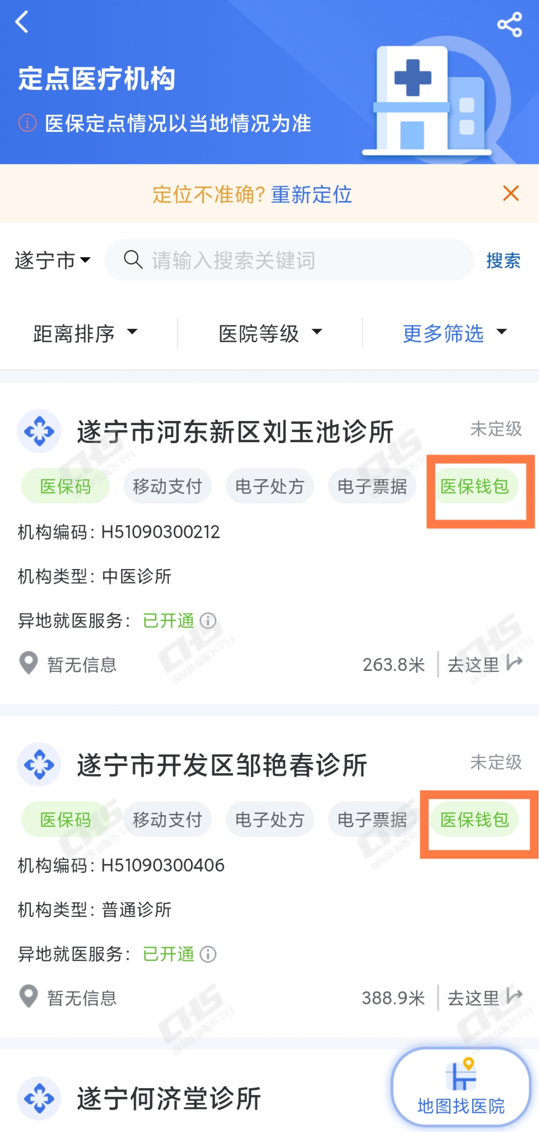 通过国家医保服务平台APP查询服务进入【定点医疗机构】和【定点零售药店】,可查询当前已开通医保钱包支付的定点医药机构。