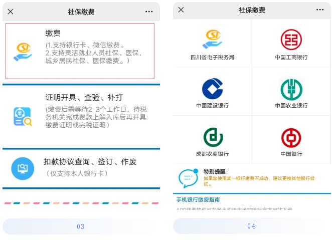 途径 微信搜索“四川税务”公众号—办税缴费—社保缴费—缴费—选择相应的银行缴费即可。