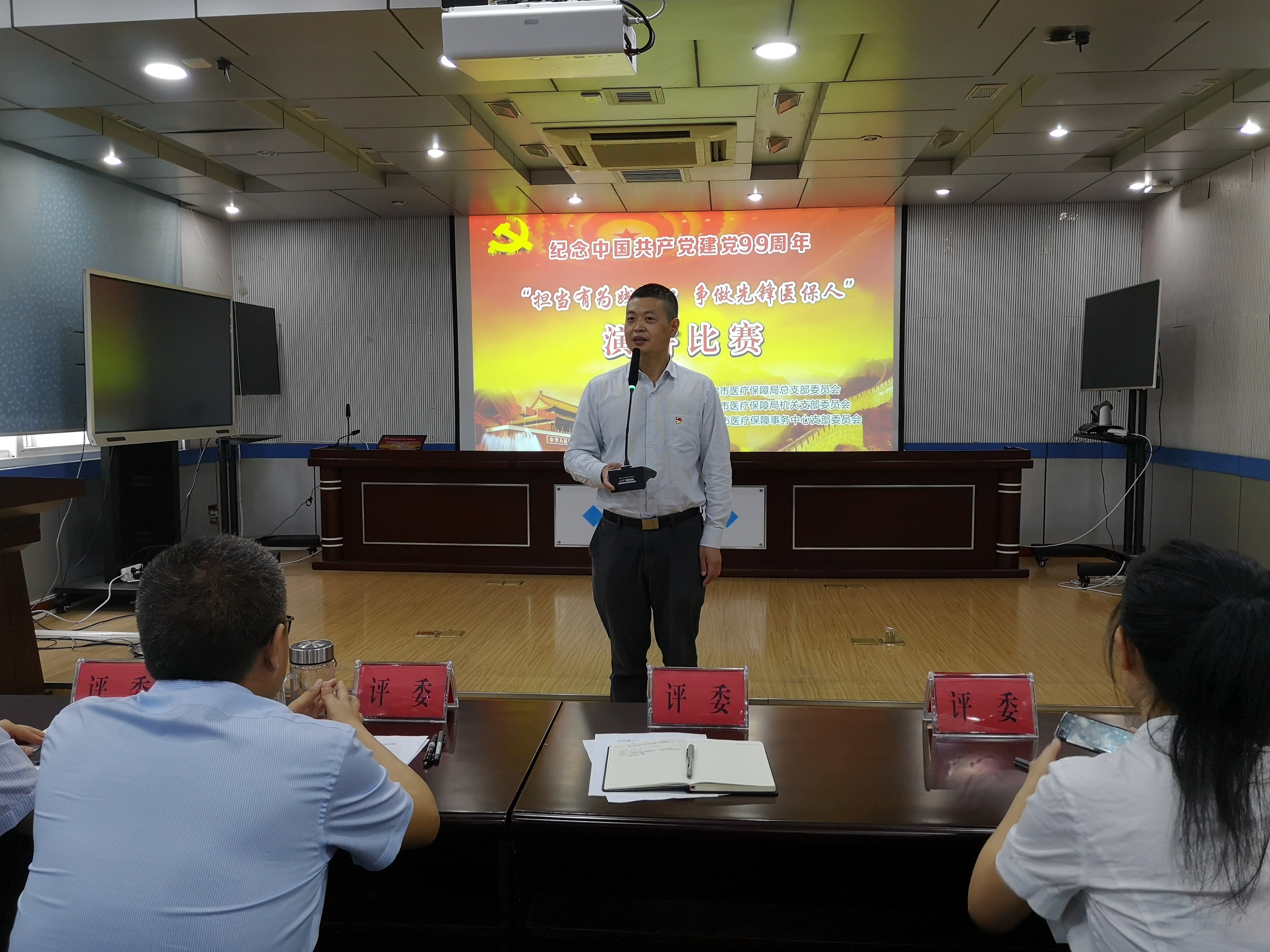 (三)开展演讲比赛,讲好医保故事。参赛选手围绕"担当有为践初心 争做先锋医保人"主题,忆往昔、看今朝,话责任、讲担当,明初心、践使命,进一步激发了医保人的奋斗精神,凝聚了全体党员的前进力量。局党组书记、局长张智勇高度肯定参赛选手的综合素质,称赞参赛同志和主持竞赛的同志表现令人"眼前一亮""耳目一新",唤起了观众的思考和共鸣,希望各党支部组织更多形式创新、内容丰富的党建活动,让活动形式"亮"起来;希望全体党员强化主人翁意识,积极参与党支部活动,让活动成员"活"起来;希望全体党员在工作实践中发挥先锋医保人的作用,让活动意义"实"起来。