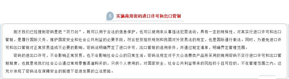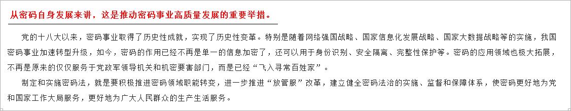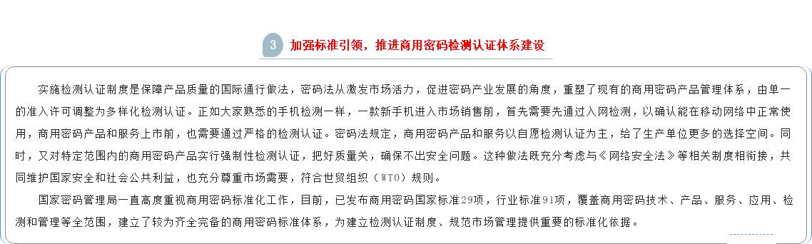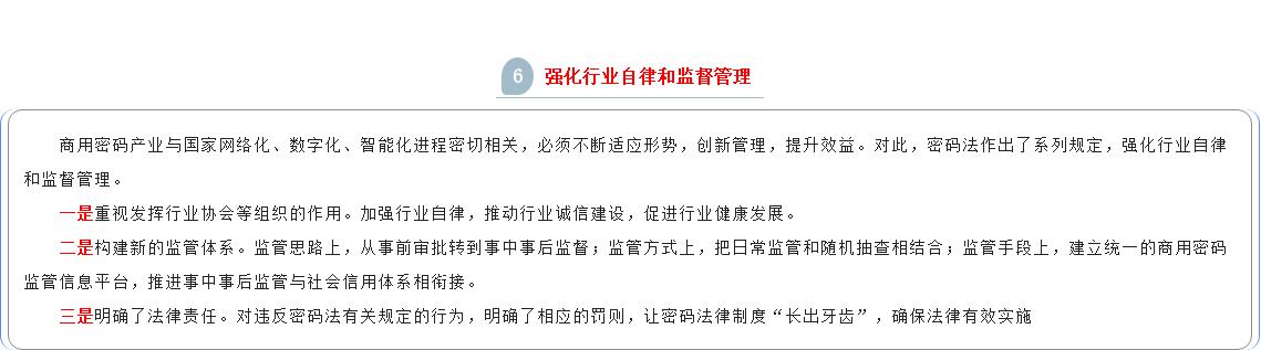 按照党管密码原则和简政放权的要求,密码法在商用密码科技创新、产业发展、人才培养、教育培训、标准化、检测认证、密码应用、进出口、电子认证、行业自律、监督管理等方面作出相应规定。