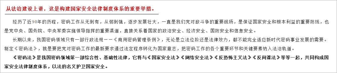 2019年10月26日,十三届全国人大常委会第十四次会议通过《中华人民共和国密码法》,习近平主席签署第35号主席令予以公布,将于2020年1月1日起正式施行。密码法的颁布实施,是我国密码发展史上具有里程碑意义的大事,有助于提升我国密码工作的规范化、科学化、法治化水平,对维护我国网络空间安全、促进信息化发展具有重要意义,也直接关系企业商业秘密的依法保护,关系社会公众在网络空间生活的安全和便利。