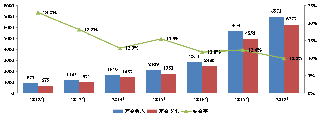 2、基金收支规模不断扩大。2018年,居民医保基金收入6971亿元,支出6277亿元,分别比上年增长23.3%、26.7%[4]。2018年,居民医保基金当期结存694.6亿元,累计结存4372.3亿元。