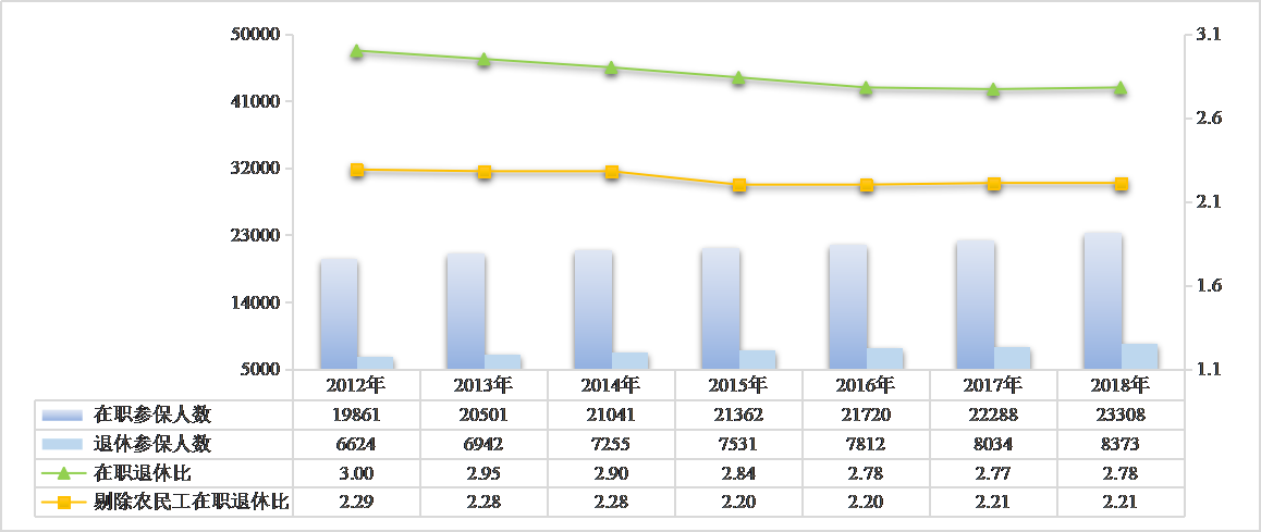 1、参保人数持续增加。2018年,参加职工医保31681万人,比上年增长4.5%。其中在职职工23308万人,比上年增长4.6%;退休职工8373万人,比上年增长4.2%。在职退休比为2.78,同比略微上升。