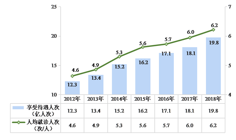 3、享受待遇人次和医疗费用持续增加。2018年,居民医保参加人员共享受待遇16.2亿人次,比上年增长8.4%。居民医保人均享受门诊待遇1.7次,与上年基本持平。2018年,居民医保医疗费用10613亿元,比上年增长20.5%;人均医疗费用1183元,比上年增长17.2%。