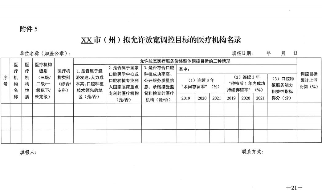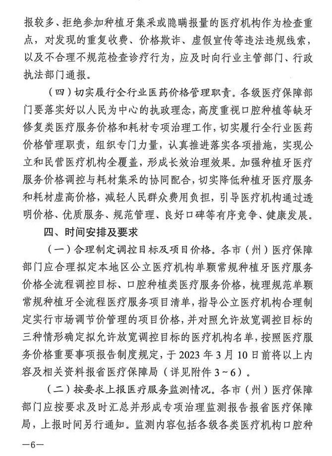 全市已开展口腔种植医疗服务的医疗机构要对照省医保局文件要求进行梳理,确定是否符合放宽价格的条件,符合放宽价格条件的医疗机构请于2023年2月28日17:30前将相关资料报送至市医保局医药服务管理科。全市已开展口腔种植医疗服务的公立医疗机构要同步梳理开展单颗常规种植牙全流程医疗服务项目清单和测算拟开展的市场调节价管理口腔种植医疗服务价格项目成本,全流程服务清单及项目成本测算表请于2023年2月28日17:30前报送至市医保局医药服务管理科(联系人:邹劲,联系电话:0825─2257612)。对于承诺参与种植牙耗材集中带量采购、接受单颗常规种植牙全流程价格调控的民营医疗机构,调控价格按照公立医院确定。
