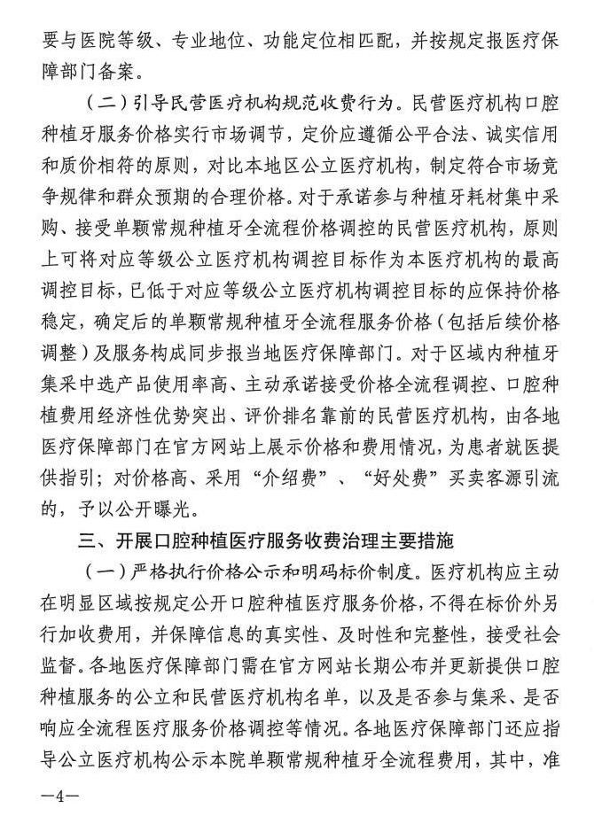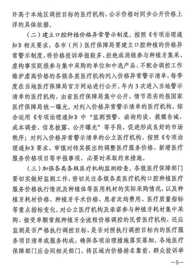 全市开展口腔种植服务的医疗机构要严格执行价格公示和明码标价制度,不得在标价外另外加收费用,并自觉主动接受监督。各县(市、区)医保局、市医保中心要加强对辖区医疗机构口腔种植医疗服务项目执行情况及种植体耗材采购情况的监督,对投诉举报较多、拒绝参加种植牙集采的医疗机构纳入异常警示清单,及时向市医保局报送,市医保局将定期在网站对相关情况进行公开。