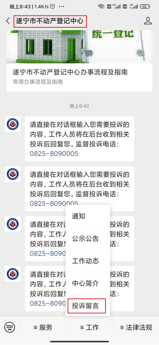 投诉路径:进入“遂宁市不动产登记中心”微信公众号,点击“工作”菜单 ,选择“投诉留言”,可选择在线留言或拨打电话进行投诉