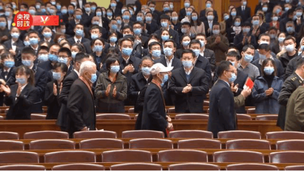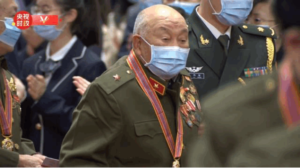 大会现场,志愿军老战士入场,现场全体起立,向老英雄致敬!