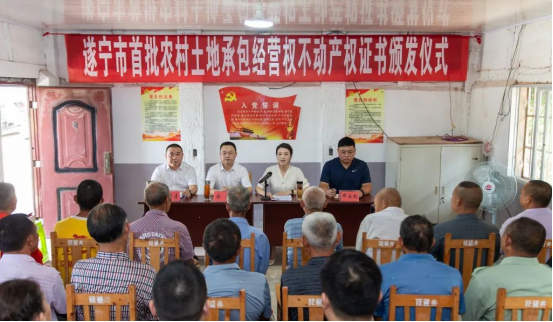 当天,遂宁市首批农村土地承包经营权不动产权证书颁发仪式在蓬溪县新会镇新桥村举行,35户群众成功领取承包土地的新版“身份证”,这标志着全市农村土地承包经营权正式纳入不动产统一登记,对我市不动产登记工作具有里程碑意义。