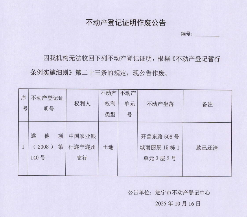 不动产登记证明作废公告(中国农业银行遂宁遂州支行)