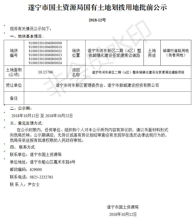 遂宁市国土资源局国有土地划拨用地批前公示(2018-12号)