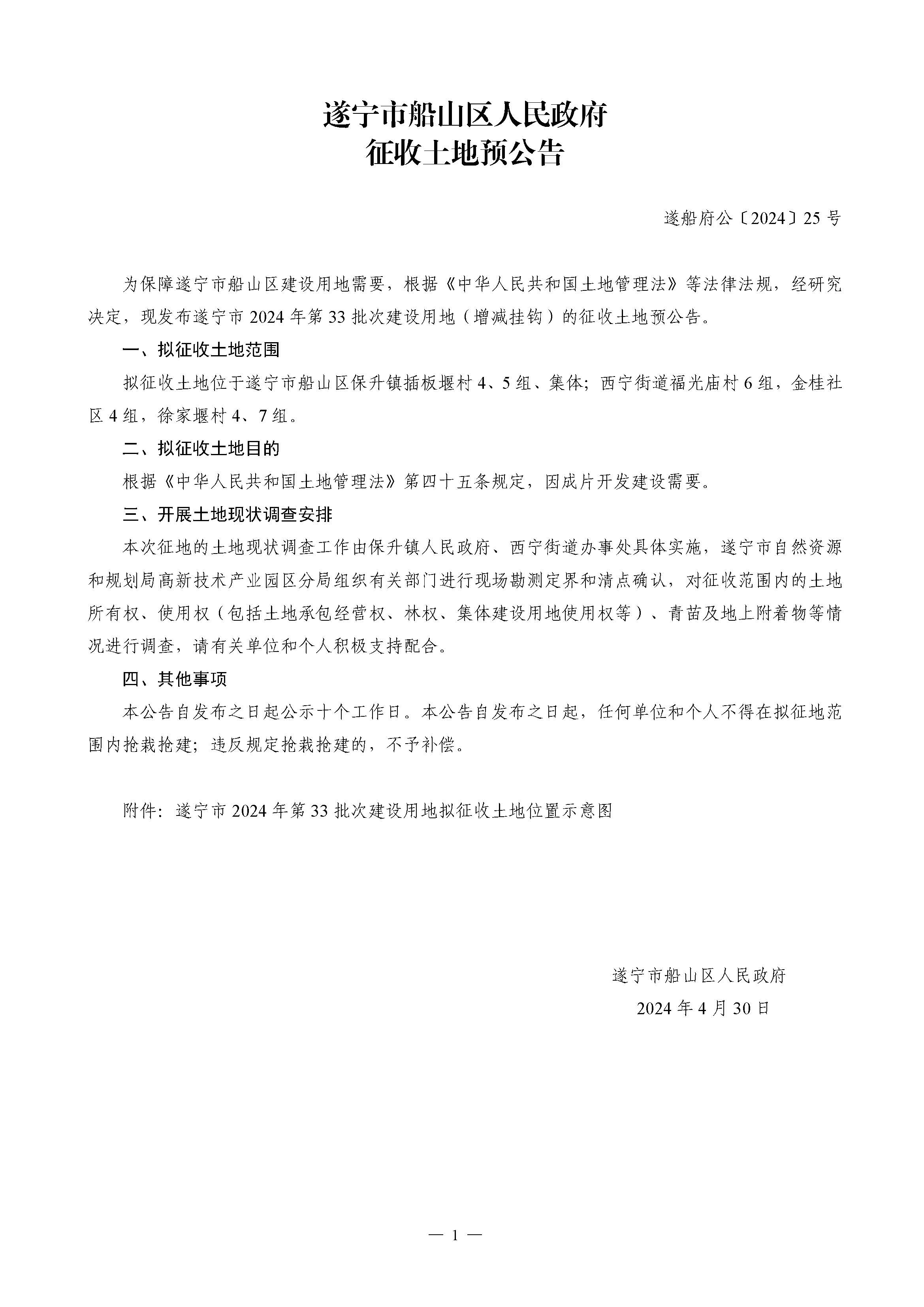 遂宁市船山区人民政府征收土地预公告 (遂船府公〔2024〕25号)