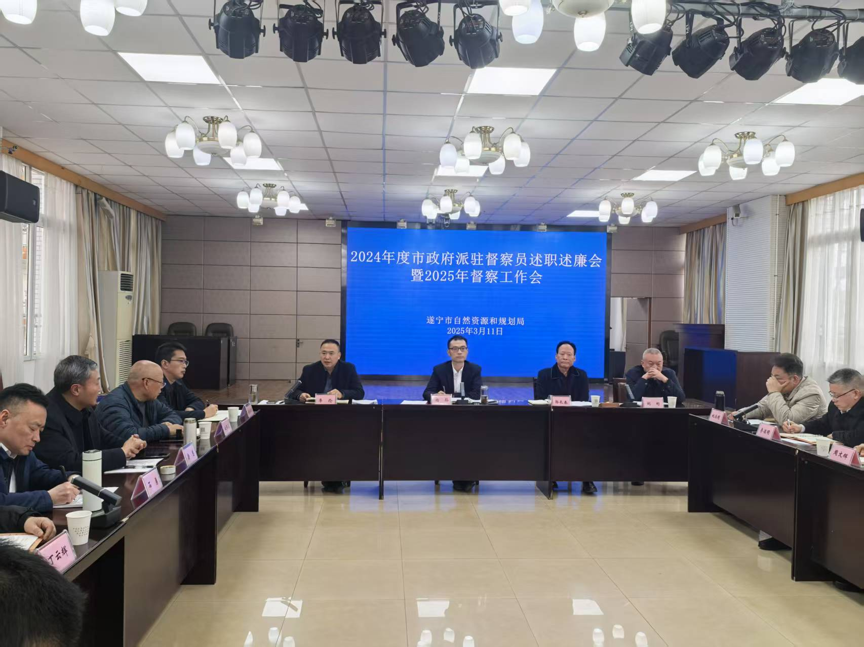 3月11日,遂宁市自然资源和规划局组织召开2024年度市政府派驻督察员述职述廉暨2025年督察工作会。局党组书记、局长杨韬主持会议并讲话,省政府派驻遂宁市自然资源督察员郭长春、刘彬受邀参加,局党组成员、副局长李伦出席会议并作工作安排。