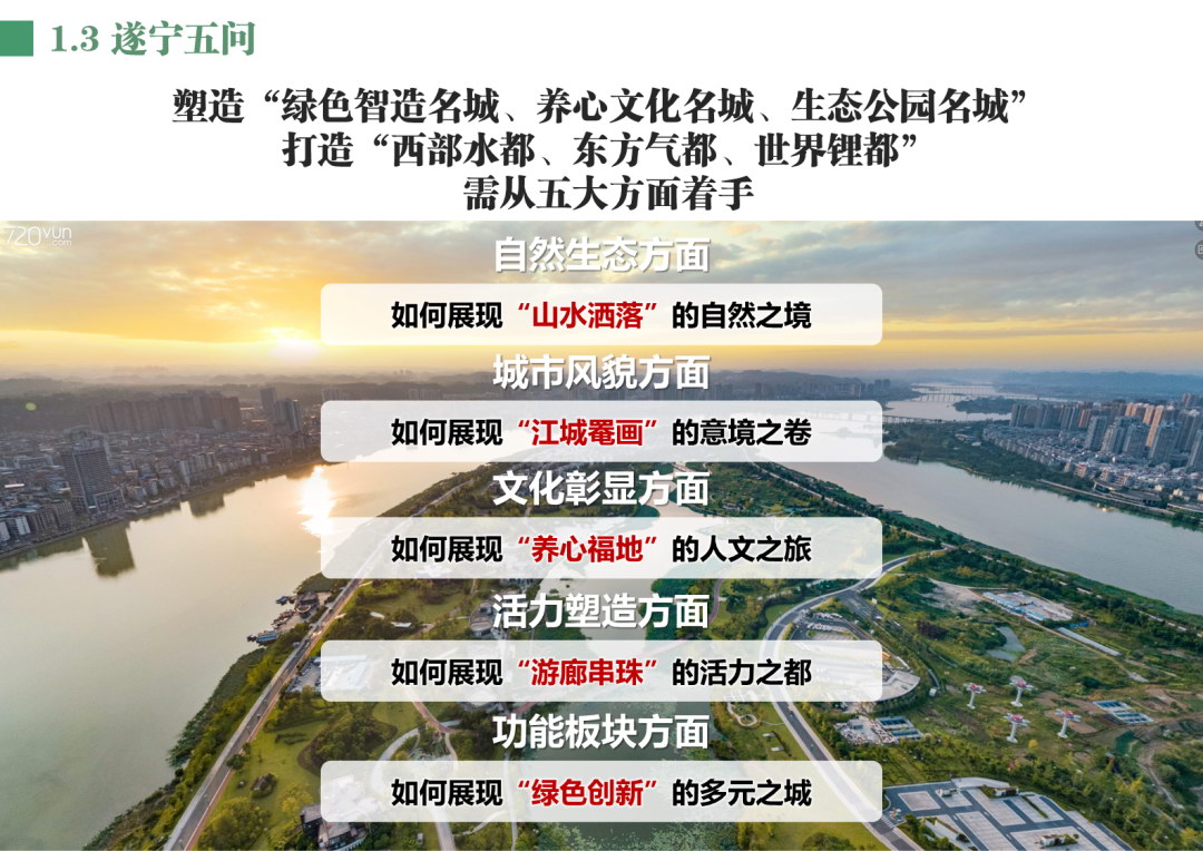 城市设计按照“问题-目标-战略-布局-机制”的逻辑,针对性地制定设计方案和实施政策措施,通过“五问五答”的形式,搭建遂宁城市风貌塑造框架。这本城市设计,聚焦“山、水、岛、城、廊”的城市印象与感知体系,主要从自然生态、城市风貌、文化彰显、活力塑造、功能板块五个方面,解决遂宁城市发展中遇到的问题。
