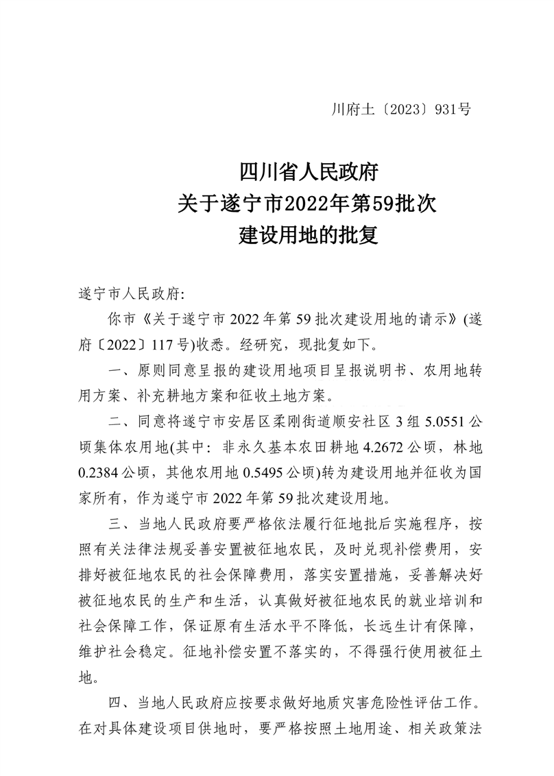 四川省人民政府关于遂宁市2022年第59批次建设用地的批复(川府土〔2023〕931号 )