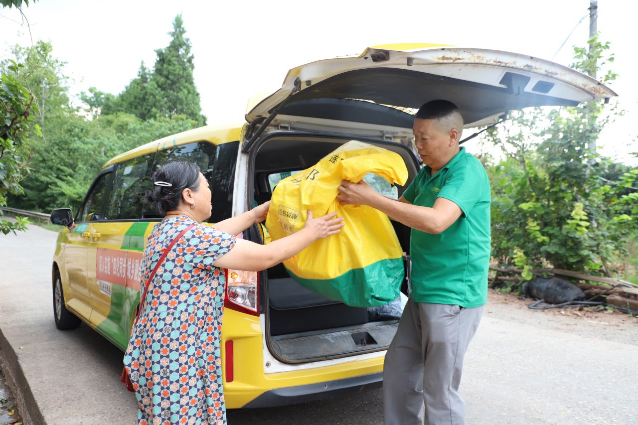 在蜿蜒的乡路上,一辆“小黄车”缓缓停靠在青狮村金通·邮快驿站。司机吴明兴利索地打开后备箱,取出几件快递,从镇上出发时,车上还满载着200多件包裹,此刻已所剩无几。“我每天的任务就是准时把快递送到负责的24个村。”吴明兴一边整理包裹一边说。