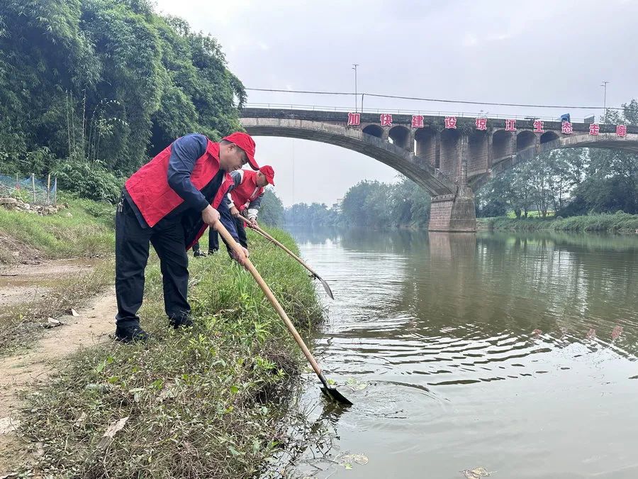 安居区三家镇三门村巡河护河队伍对河道进行清理
