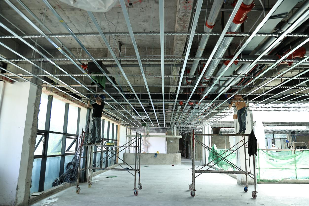 “目前消防、暖通、给排水系统及吊顶骨架已全部完工,整体施工进度达52%。”安居区托育综合服务中心项目负责人何祥介绍,接下来还将进行吊顶封板、地砖铺贴及塑胶地板铺设,预计7月底能完工初验。