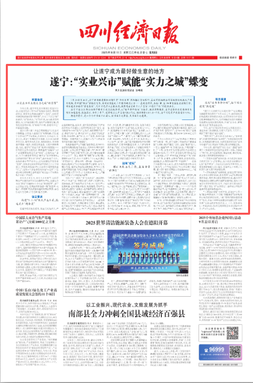 9月18日,《四川经济日报》头版头条推出反映遂宁以“实业兴市”赋能“实力之城”焕新蝶变的重要报道。文章从遂宁全力构建“5+1+N”现代产业体系,做优做强优势产业、做新传统产业、做大新兴产业等角度,全面展示遂宁以“实业兴市”为抓手,进一步夯实产业根基,强力打造“实力之城”的生动实践。