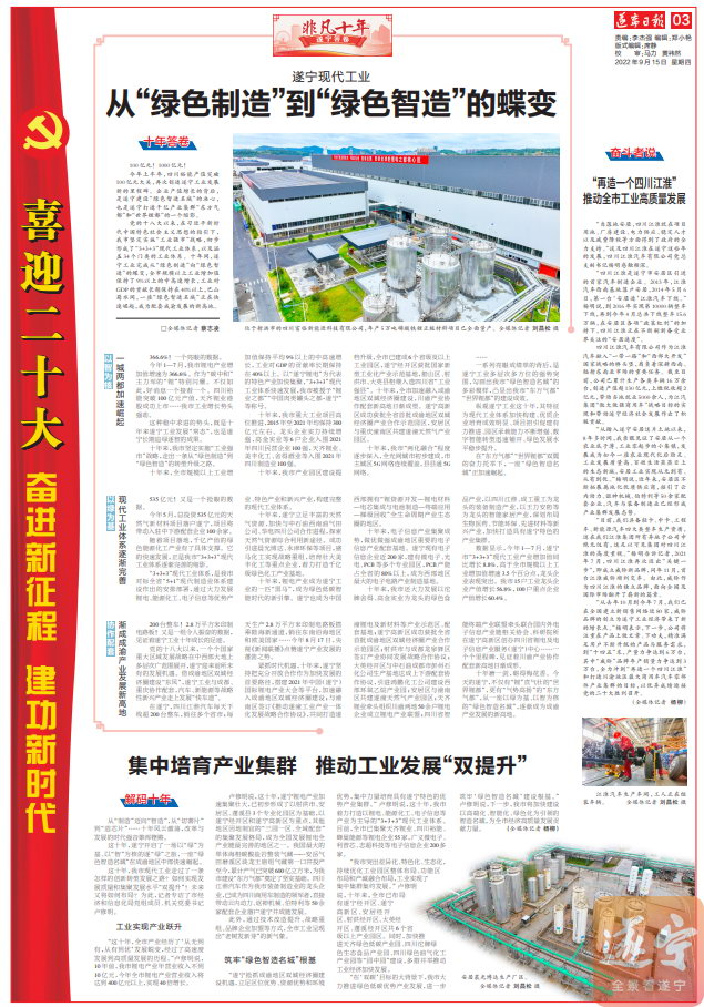 回望过去,一串串亮丽的数字,展示着十年来遂宁工业经济发展的辉煌成就。展望未来,在新征程新起点上,遂宁工业将以更加昂扬的姿态,以“绿”为基,以“智”为核,推动“绿色智造名城”强势崛起。