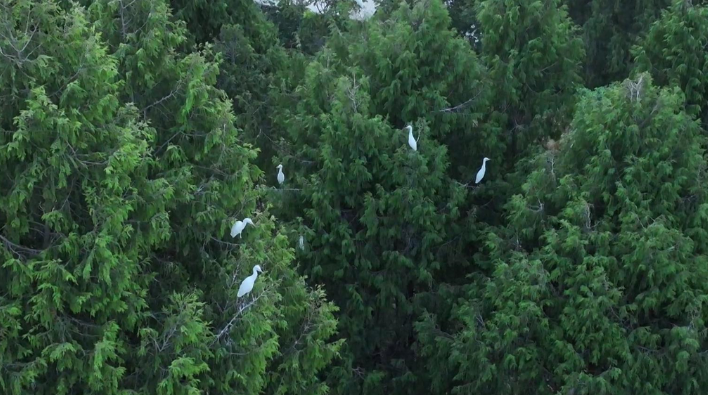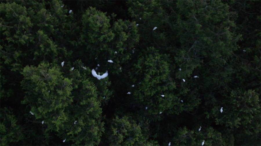 在记者的无人机镜头下,傍晚时分的复兴镇新桥村湿地周边生机盎然,成群结队的白鹭藏于林间,或在枝头筑巢、嬉戏,或轻啄羽毛婉转啼鸣,或展翅高飞……据当地村民介绍,每年夏季,白鹭成群结队来到新桥村,直至秋末冬初再往南迁徙。