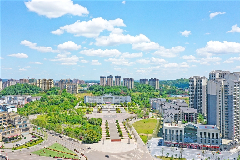 蓬溪县城一隅,呈现天蓝地绿美好场景。