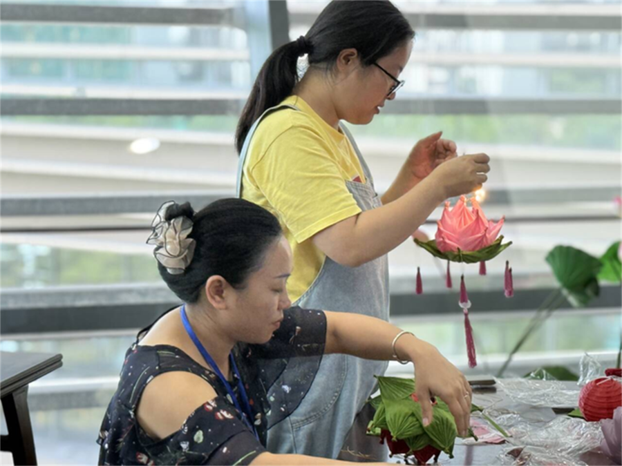 在制作花灯环节中,教师们细心拼接灯架、裁剪灯纸,一盏盏莲花灯在翻飞的指尖缓缓成形。暖黄灯光透过花瓣,为节日增添了别样的浪漫气息。
