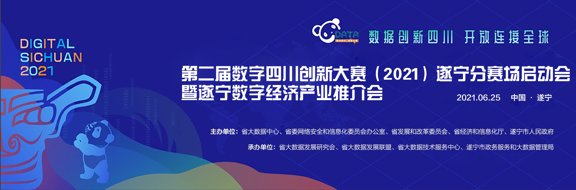 2021数字四川创新大赛遂宁分赛场启动会暨首届数智四川发展研讨会由省大数据中心、省委网络安全和信息化委员会办公室、省发展和改革委员会、省经济和信息化厅、遂宁市人民政府主办,由省大数据发展研究会、省大数据发展联盟、省大数据技术服务中心、遂宁市政务服务和大数据管理局承办,主题为“数据创新四川·开放连接全球”。