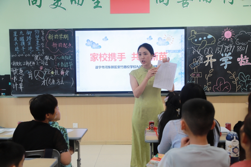 温馨打卡墙、励志标语、精美的学生画作……上午9点,走进遂宁市河东新区紫竹路小学校,学生们纷纷在校门前的打卡墙前合影拍照,同时,教室里还精心布置了主题黑板,各班班主任为学生和家长准备了干货满满的“家校携手”第一课。