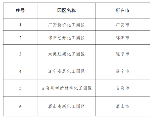 4月1日,四川省经济和信息化厅、四川省发展和改革委员会、四川省自然资源厅等6部门发布通知,公布我省首批化工园区名单,共有6个化工园区上榜,涉及广安、绵阳、遂宁、自贡、眉山等5市。