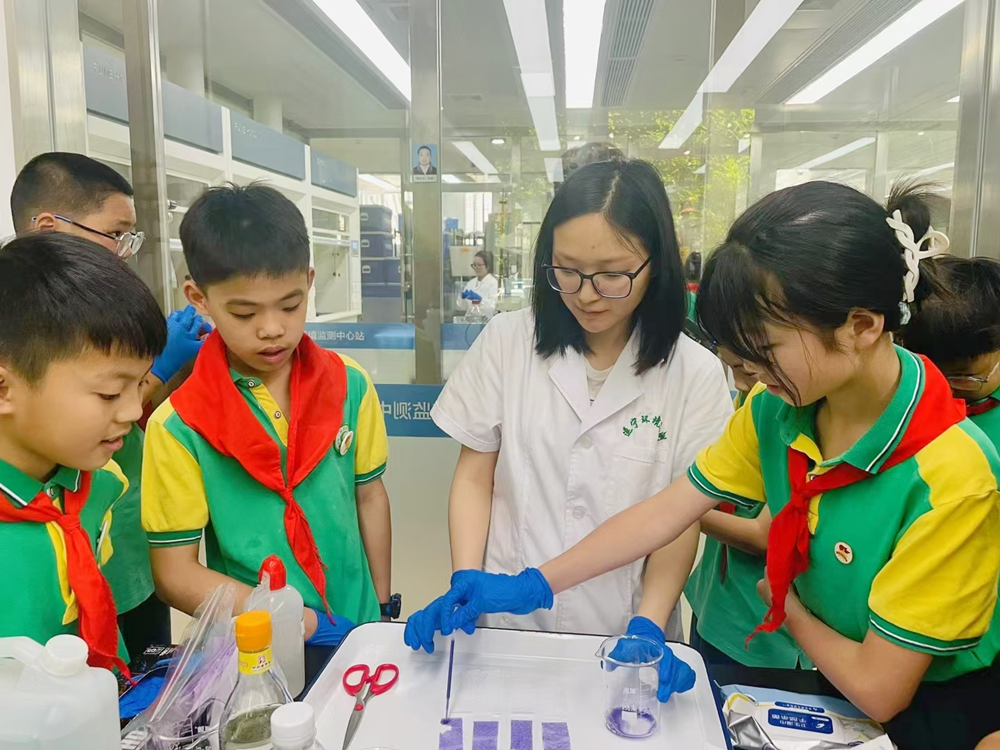 在工作人员指导下,小学员们还亲自操作了用紫甘蓝、小苏打、白醋等常见物品自制pH试纸测试溶液酸碱度,沉浸式体验了阴离子表面活性剂的测定实验,小学员纷纷举手提问,工作人员细心解答,共同探索关于环境监测的奥秘。