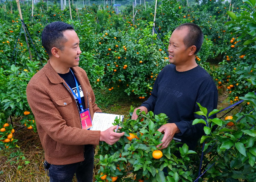 11月4日,船山区河沙镇人大代表王玉东在凤凰村柑橘基地,调研品种改良、销售渠道、农民增收,助力特色农业提质增效。