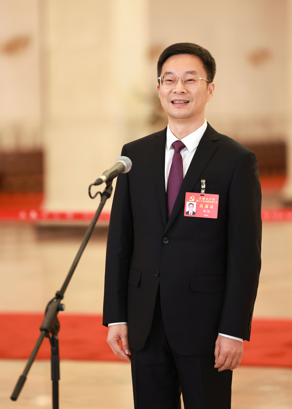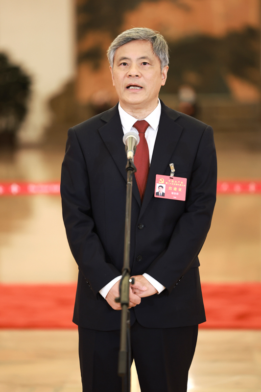 这是开幕会前,朱有勇、王亚平、武大靖代表(自左至右)接受采访。