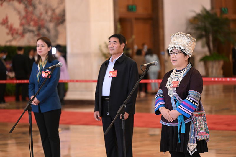 这是开幕会前,姜丽娟、孙金龙、於若飞代表(自左至右)接受采访。