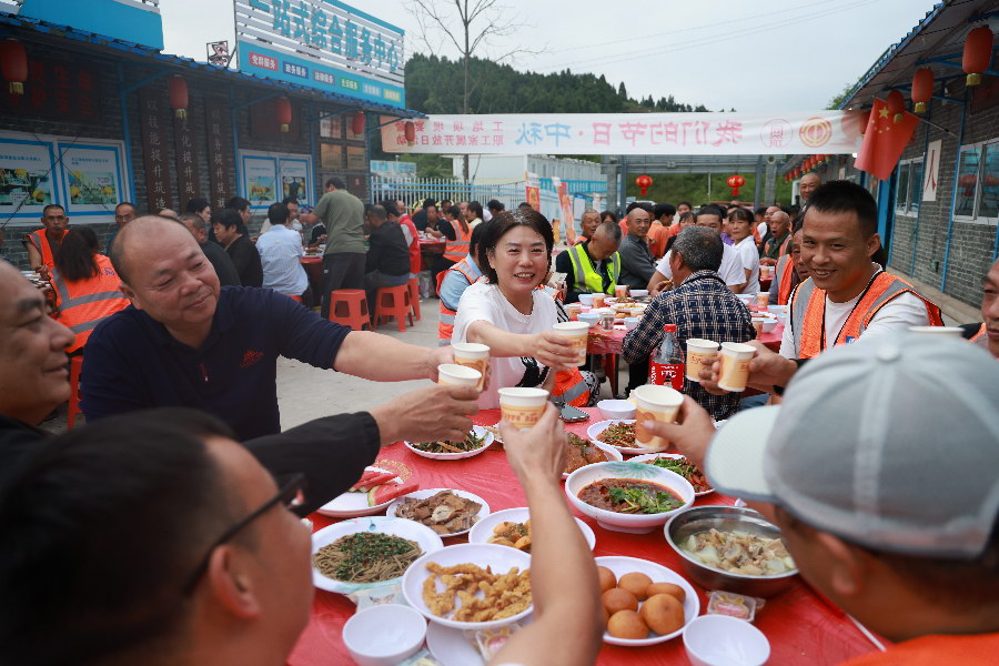 傍晚6时,随着一声响亮的“开席啰……”,坝坝宴正式开席。一道道热气腾腾的家乡菜陆续上桌,大家围坐在一起,举杯共饮,互道祝福。宴席期间,《我和我的祖国》合唱将现场气氛推向高潮,建设者们用歌声表达对祖国的深情,也唱出坚守一线、共筑梦想的坚定信念。