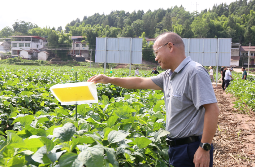 在观摩现场,300亩核心示范区集中展示了病虫害精准监测、种衣剂拌种、封定协同除草、理化诱控等全程绿色防控技术集成成果。据了解,该示范基地内玉米已获丰收,亩产约650公斤;大豆正处于花期至结荚期,长势良好,病虫草害得到有效控制。四川农业大学雍太文、常小丽等专家向与会代表详细介绍了基地绿色防控技术集成情况,我市的示范基地建设成效获得了与会专家的一致好评。