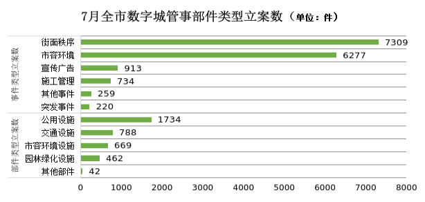 从立案数量分析,市级平台(船山区及市直园区)立案10124件,同比下降24.6%,其中城市事件类型82类、7743件,城市部件类型88类、2381件。县级平台(射洪市、蓬溪县、大英县、安居区)共立案9283件,同比增加5.2%,其中城市事件7969件、城市部件1314件。