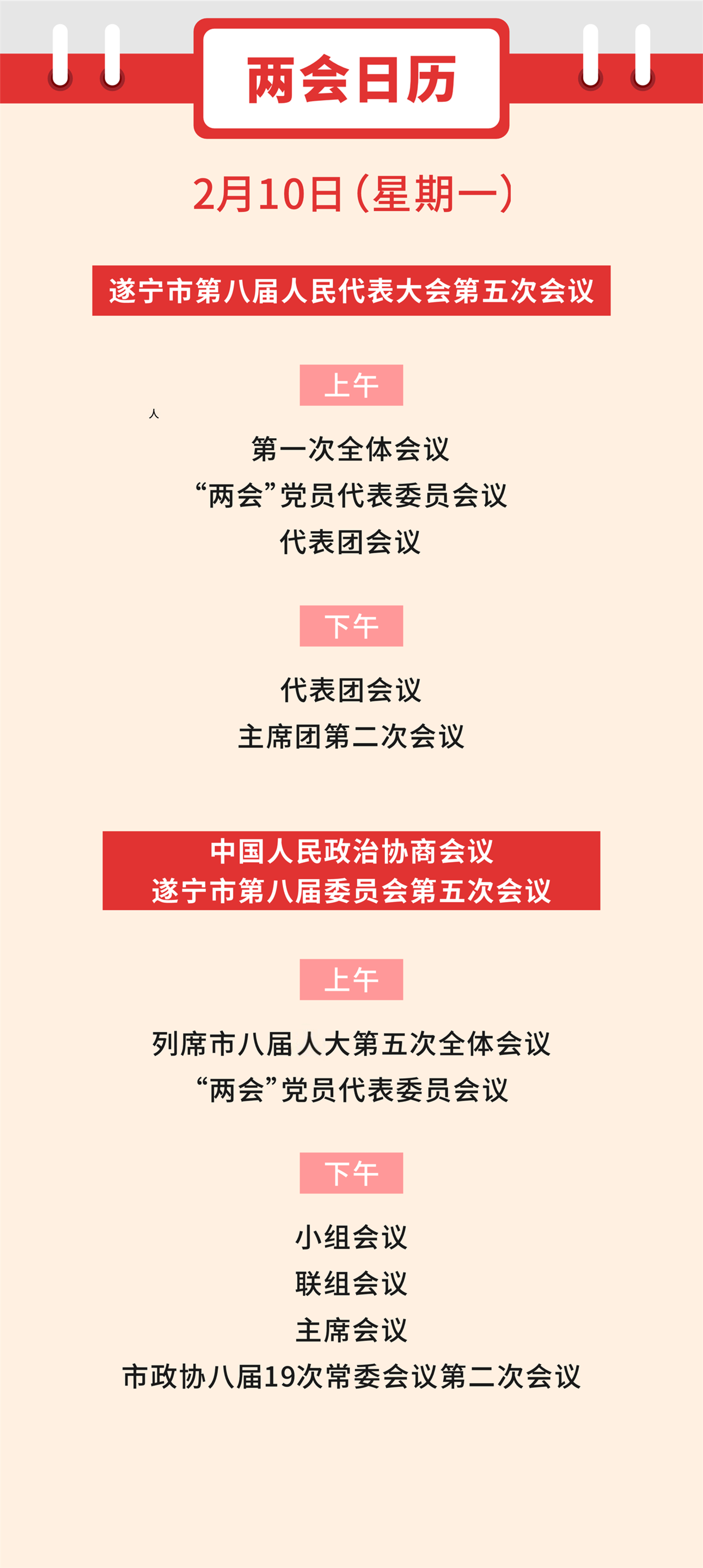 两会日历(2月9日)市政协八届五次会议上午:市政协八届五次会议第一次全体会议(开幕会)下午:小组会议、提案审查会市八届人大五次会议下午:报到、代表团召集人会议、代表团会议、代表团中共党员会议、预备会议、主席团第一次会议