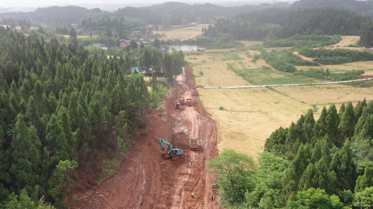 在安居区QC02安居至潼南崇龛界公路(安居至三家段)项目现场,多台大型机械正在进行路基施工。该条道路途经杨家湾村、万家沟村、高滩坝村等,路线全长14.417公里,是邻近村落通往安居城区的主要道路。