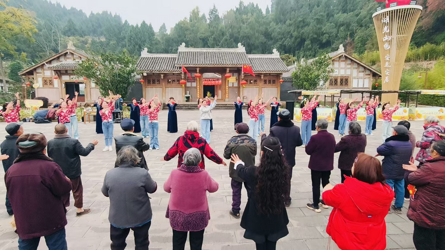 演职人员与乡村老年人共同做手指操。
