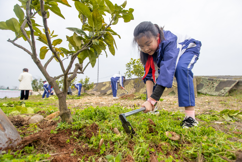 植树现场,部队官兵、退役军人代表、教师代表和少先队员们结成“护绿小队”,大家分工明确,配合默契,挥锹铲土、扶苗填坑、提水浇灌,一丝不苟完成每一道工序,在大家的共同努力下,一棵棵新栽种的桃树昂首挺立,在营区“安家落户”。